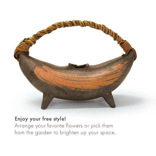 Japanese Pottery Crescent Flower Vase with Vine, Brown-black, Shigaraki-yaki – Handmade Ceramic Art, Wabi-Sabi Minimalist Decor
